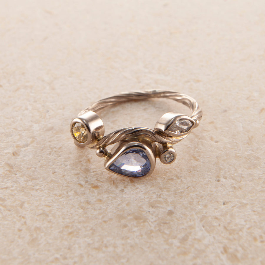 Pæreformet blå safir, 0,07 ct. navette-slibet diamant, 0,17 ct. og 0,02 ct. TW vs brillantslebne diamanter