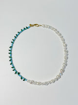 Dyrkede ferskvandsperler og grønne og lyseblå glasperler. Lås i 14 karat Guld Vermeil (en ekstra tyk forgyldning) over en base af sterlingsølv. Halskæden er 45 cm lang, og hver perle har deres egen uregelmæssige og unikke form og måler mellem 0,5-1 cm.