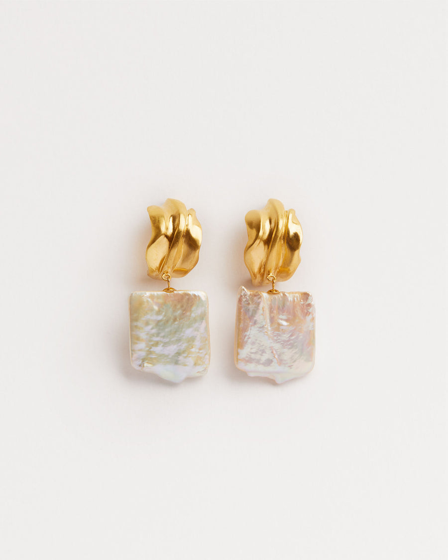 Dobra-øreringene giver indtryk af stof, der er presset ind i metal, og folder, der snor sig til en skulpturel form. Fås i genanvendt sterlingsølv eller sterlingsølv med 18 karat guldbelægning. Håndlavet og færdiggjort i deres London-studie ved hjælp af metoden med tabt voks. Da hver keshi-perle er unik, vil hvert par variere en smule og måske ikke være identisk med det, der er afbilledet.