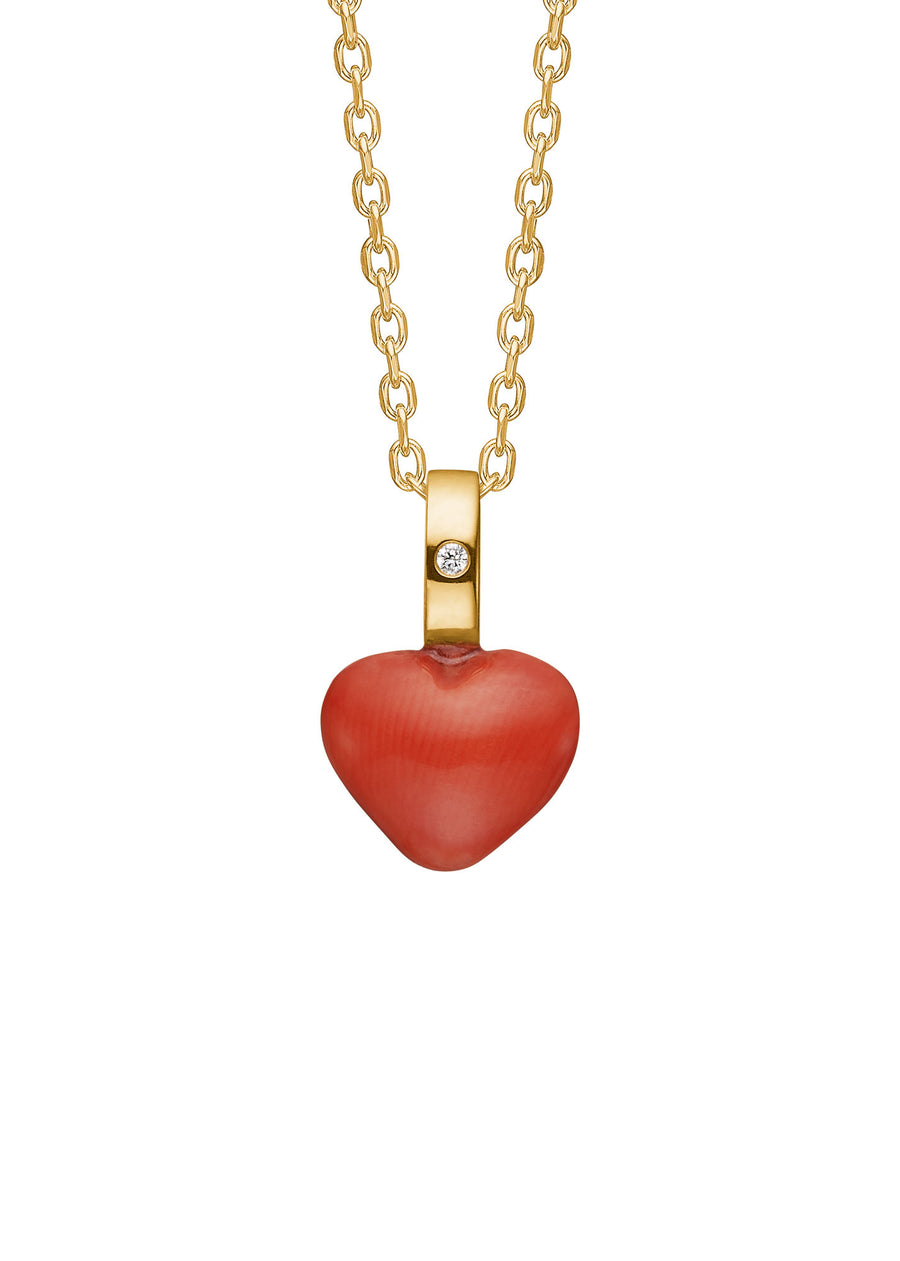Det fantastiske Heart-vedhæng er lavet med en hjerteformet Red Coral-ædelsten og er fattet med en 0,005 carat brillantsleben diamant i øjet. Vedhænget er en del af Heart of Giving-kollektionen, der fokuserer på at bære symboler på kærlighed tæt på hjertet med hjerteformede vedhæng med fødselssten og diamanter.