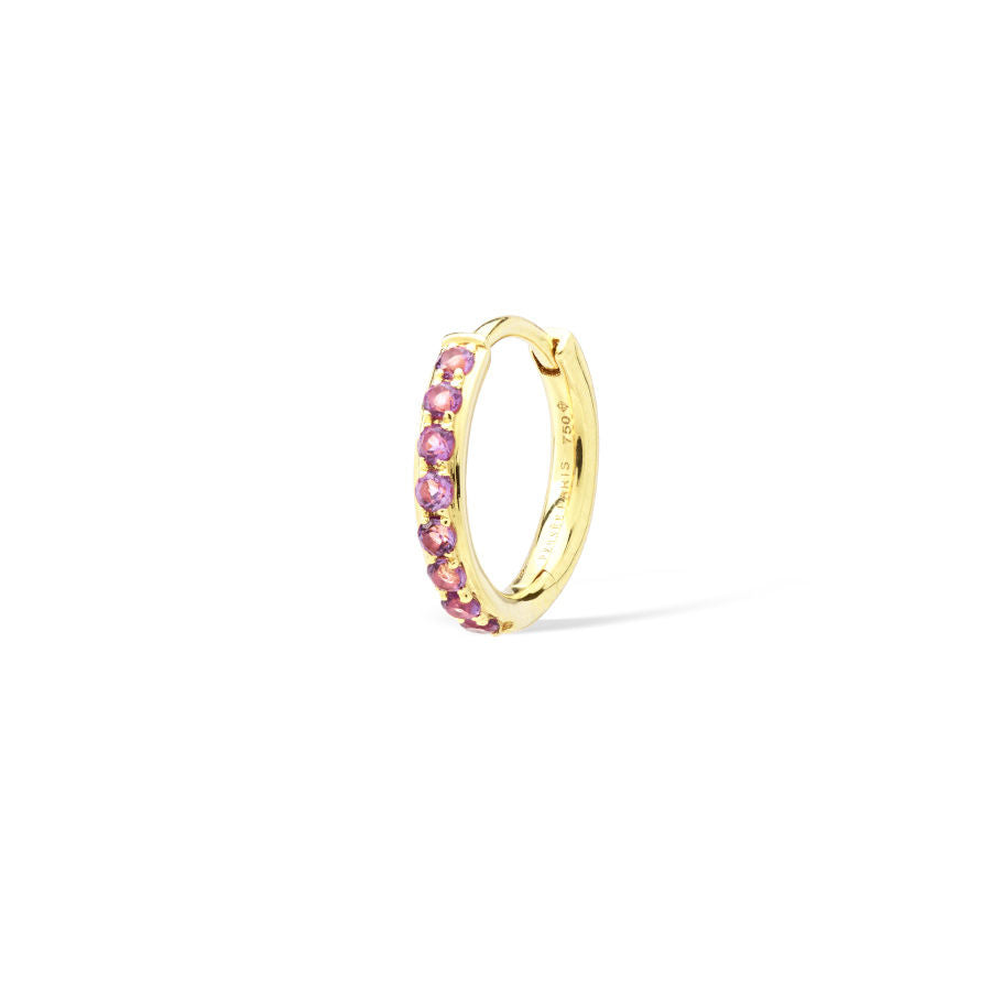 Chakras lilla ametyst Piercing Hoop fra Persée Paris er et enkel og elegant mini hoop designet til piercede ører. Den er lavet i 18 karat guld og er en del af Piercings Collection By Persée, som har taget kreativitet og originalitet til et nyt niveau. Forsiden af ​​dette mini hoop er belagt med en række af lilla ametyster i en enkel og overskuelig fatning. Den sælges som single og er iøjnefaldende i sin klassiske lilla og guld kombination.