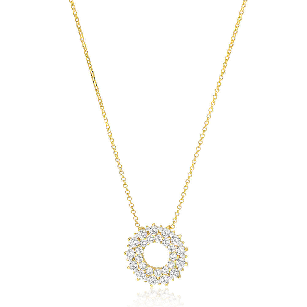 Halskæde udført i 18 karat forgyldt 925 sterling sølv, blankpoleret overflade og håndsatte facetslebne multifarvet zirkoner. Halskædens mål: Diameter 18,5 mm, tykkelse 2,7 mm, kædelængde op til 45 cm - justerbar