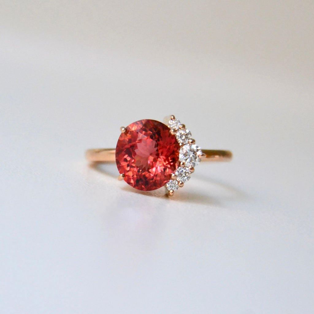 18K rose gold // natural, unheated orange tourmaline (2.60ct) // VS1-TW diamonds (total weight of 0.20ct). Mit einem Zertifikat geliefert. Die Edelsteine in diesem Ring sind in einer niedrigen Einstellung eingestellt. Diese Art der Einstellung erfordert ein montiertes Ringband, wenn Sie es stapeln möchten. The center stone measures 9.06 x 8.13mm. The depth of the setting is 7mm. The diamonds measures 3, 2 and 1.5mm. The ring band has a full round band profile and measures 1.5m. Alle unsere Ringe sind mit der europäischen Standardgröße dimensioniert. Der Ring ist bereit, in Größe 54 versendet zu werden - die Größe ist möglich und ist kostenlos