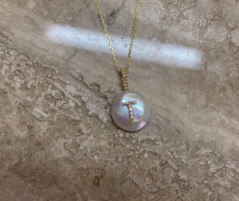 This initial is casted from 18Karat Yellow Gold and set with natural glimmering diamonds on a freshwater petal shaped pearl. Each petal pearl is handpicked for its luster and one-of-a-kind beautiful appearance.