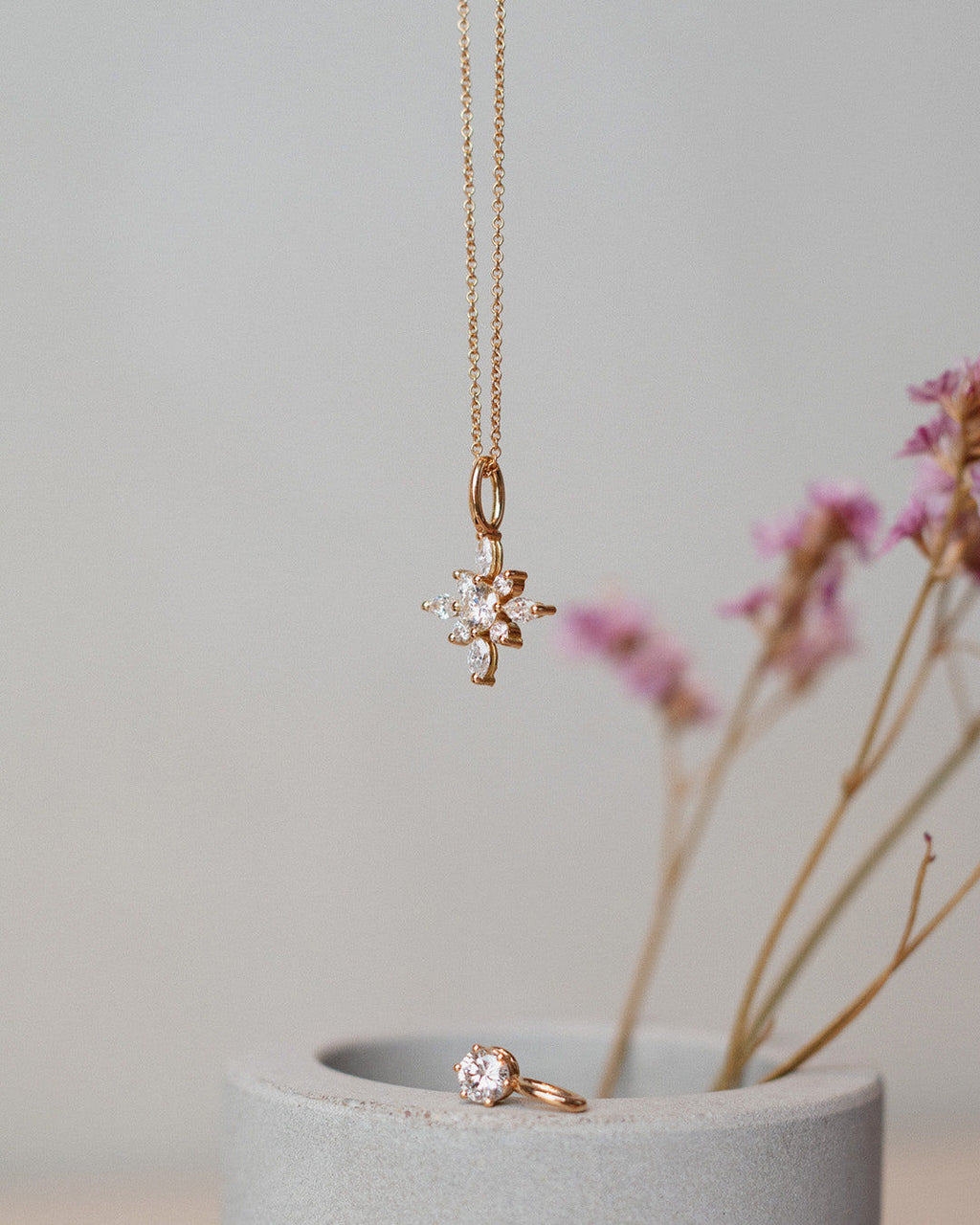 A beautiful necklace that symbolizes your own Northern Star. Let it guide you to your own direction... ☆Cecilia from Mumbaistockholm shares: "When I first designed this piece, I designed it as a compass. When I released it, people told me it looked like a star or a snowflake. To me the three symbols all stand for the same thing: to follow your own path! Promise me to follow yours ♥"... You can purchase only the pendant and wear it on a chain you already have - or add our beautiful bare gold chain to your order. Details: Pendant: Made in Sweden from 100% recycled 18K gold. Four 1.7 x 3.5 mm (approx. 0.04 CT) Marquise-Cut Diamonds TWVS, four 0.02 CT Diamonds TWVS and one 0.20 CT Diamonds TWVS. Total CT weight: 0.44 CT. Mumbaistockholm use only natural, conflict-free diamonds. Chain: The bare gold chain is 1 mm in diameter so super thin and beautiful! Choose between a shorter chain (36 cm) or full length (40 cm). Size and Fit: The width/length of the pendant is 12.1 mm (without the loop) and the height is 2.9 mm. The length of the loop is 5.7 mm and the inner measurement is 4.1 x 1.8 mm. Wear it on a hoop earring or with a long or short chain. The pendant is made to fit most chains, but measure to make sure that the loop of your chain fits the loop of the pendant. Production and Delivery: Please allow 6-7 weeks for your jewelry to be handcrafted in Mumbaistockholms studio. If you have a specific date in mind, please write this to customercare@thejewelleryroom.com. However, we will not be able to guarantee delivery at this date.