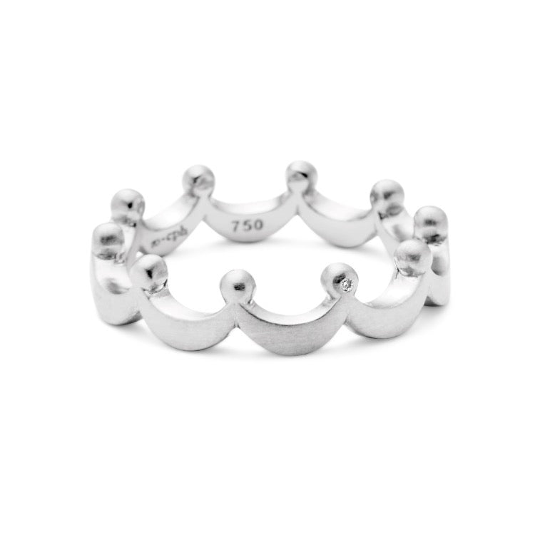 The Royal Ring with Dots in 18K White Gold. "Fairy Tales Do Come True." Lovely crown ring that you can carry without being a princess or queen. Ro Copenhagen's Royal rings are designed so that they can be used alone or stacked with other of our royal rings. This royal ring with dots is made in 18K white gold. Set with a calm signature diamond. Brill.0.003ct TW.VS. The Royal ring with dots is also made in 18K gold.