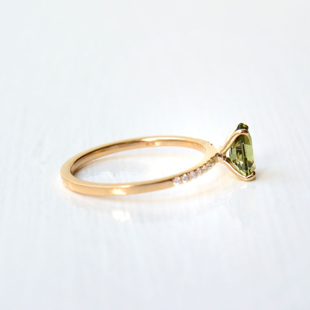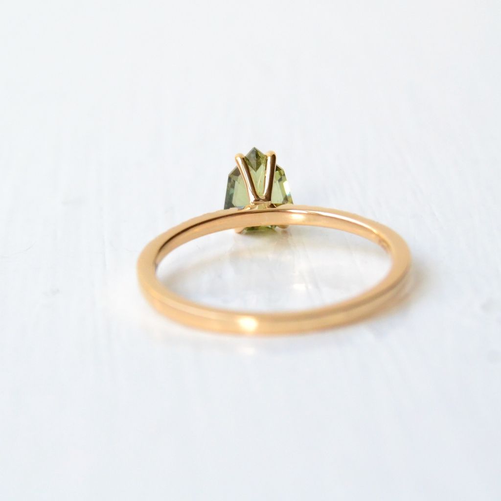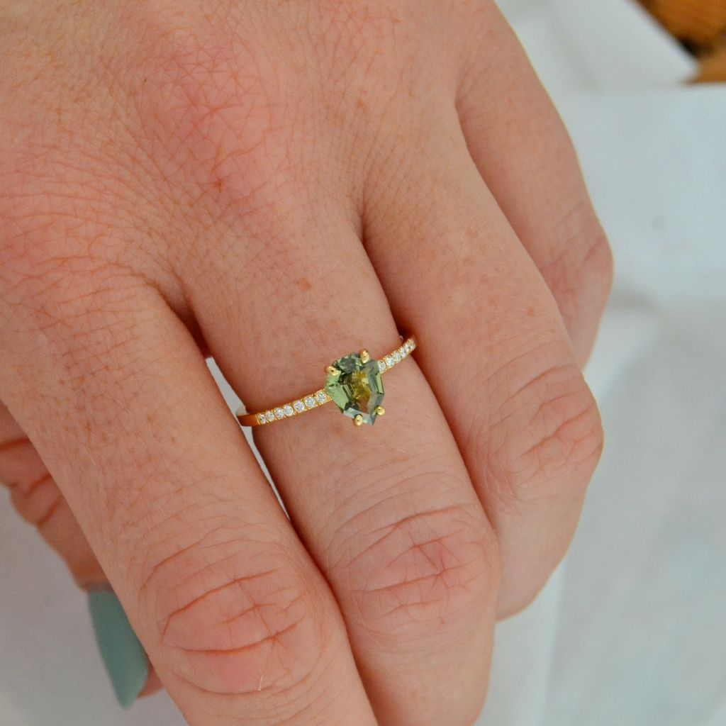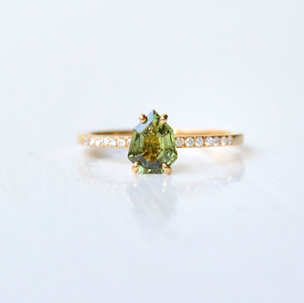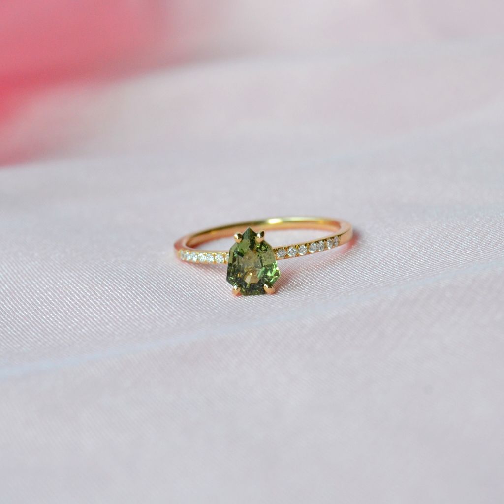 Designed by Line Jacobsen as part of the Classic Complexity Collection, the Paliha Kola Ring is a beautifully crafted piece, representative of the bold composure and inner fire of the modern woman. The unique shade of the pear-shaped, step-cut green sapphire in a high setting and the icy sparkle of the white diamonds are beautifully showcased in 18 karat yellow gold. This ring is a strong symbol of the mystical depths of the potent feminine spirit.