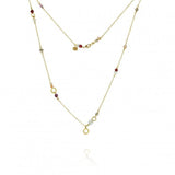 Piccolo Daybreak 18K Gold Necklace with moonstone, freshwater pearls, garnet, aquamarine, star ruby, coral, labradorite, prehnite, chalcedony, amethyst and amazonite. The chain length is 47 cm.