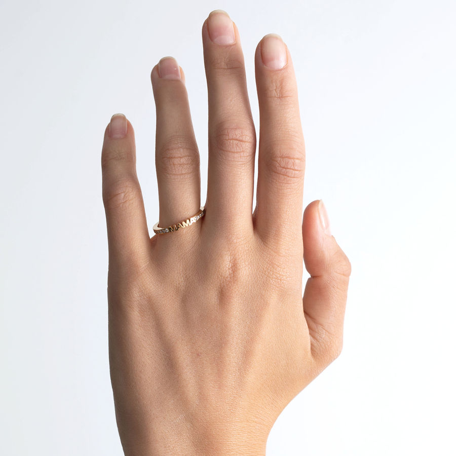 FORMÉS petite MAMA ring with modern eternity style shank from Becoming collection is created to celebrate motherhood in luxury style. It is handcrafted in solid recycled 18K yellow gold. Set with the finest quality laboratorie diamant. Ring is made by hand with the best quality and craftsmanship. Small yet so significant ring to celebrate motherhood, everyday and forever. Edgy and luxurious design with exacting craftsmanship and exceptional wearability. Set with premium laboratorie diamants, ~0,30 ct. Diamonds are FG color, VVS-VS clarity, excellent cut. Ring is 2,5 mm width, the shank is 2 mm width, ring is 3,3 g weight