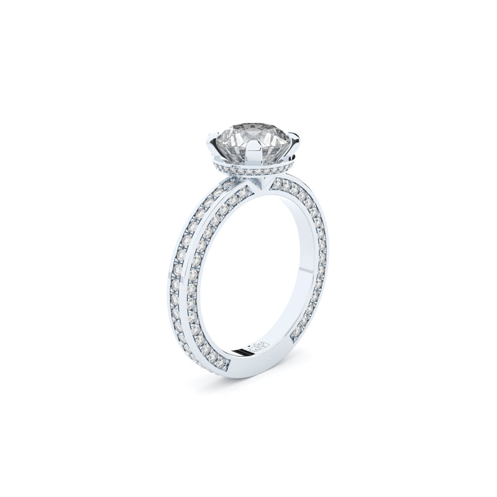 FORMÉS avant-garde engagement ring from Grace collection with 1,53 ct premium lab grown diamond is handcrafted in recycled 18K white gold. Incrusted with hundred of the finest quality laboratory made side diamonds. Ring is made by hand with the best quality and craftsmanship. Avant-garde engagement ring, that brings high end sensation. The shank is abundantly set with lab grown diamonds in advancing pave style. Central diamond is 1,53 ct, E VS2, excellent cut, no fluorescence, press here to check the international IGI certificate of the stone: https://www.igi.org/reports/verify-your-report?r=549295261l. Side diamonds ~0,75 ct, EFG color, VVS-VS clarity, finest cut. Ring shank is 2,2 mm width, with the diamond crown total ~7,5 mm, ~5,5 height