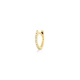 Huggie 001 in 14k yellow gold is your must-have huggie hoop with a full row of conflict-free diamonds incrusted on the front part. This size will hug your ear and is perfect for a second piercing. Add sparkle to your earparty. Wear alone or mix and match. Sold as a single. 14kt yellow gold. Diameter 10 mm