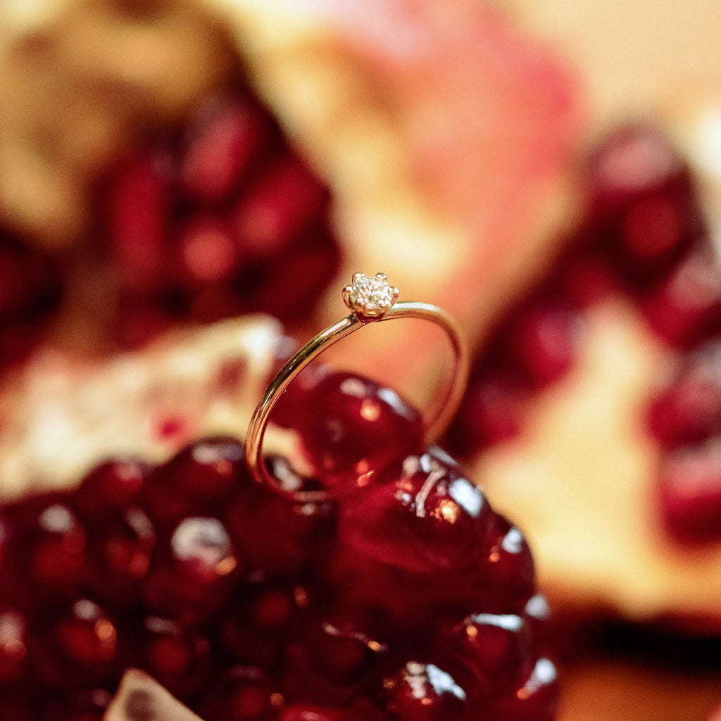 The Classic 6 Prongs Stack is a delicate engagement ring with a fine ring band and a beautiful small diamond, set in a small basket with classic six prongs. The stone sits slightly higher than the ring band, making the diamond float elegantly above your finger. Thus, the ring is ideal for stacking and sits beautifully with your wedding band. A piece for forever and for everyday, just as it should be. 18 karat gold and a diamond 0.1 ct weight. The ring band is 1.2 mm, the crown is 4 mm wide. This ring is made by hand with much love and care in the Rivour & Guya studio in the Black Forest, Germany. The gold used in all Rivour & Guya rings is ecologically river gold from Germany, mixed with recycled gold (Mass Balance Principle). The diamonds used in Rivour & Guya are of a very high quality. The diamonds are at least the G color and SI clarity and they all come from Canada (Deviak and Ekati mine) and are cut exclusively in RJC certified manufactories.