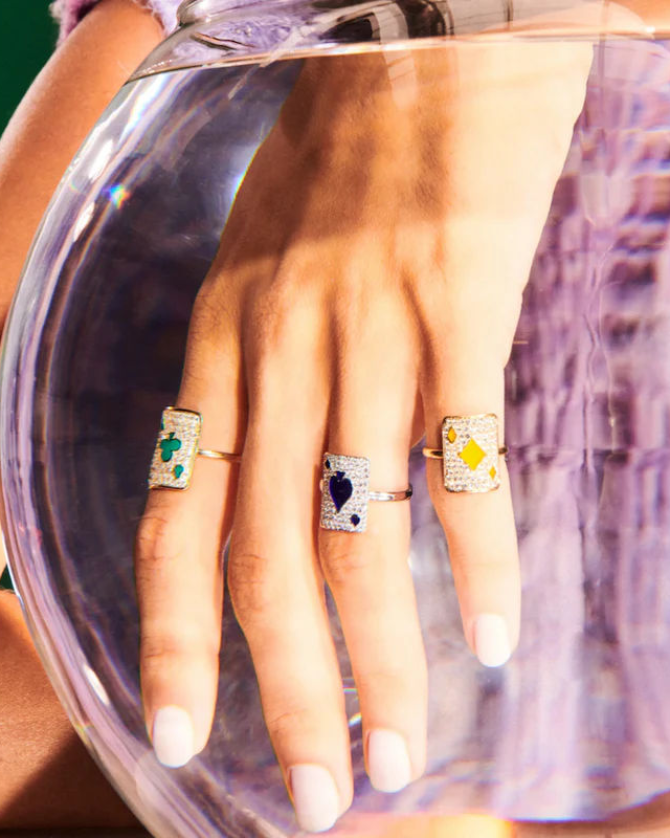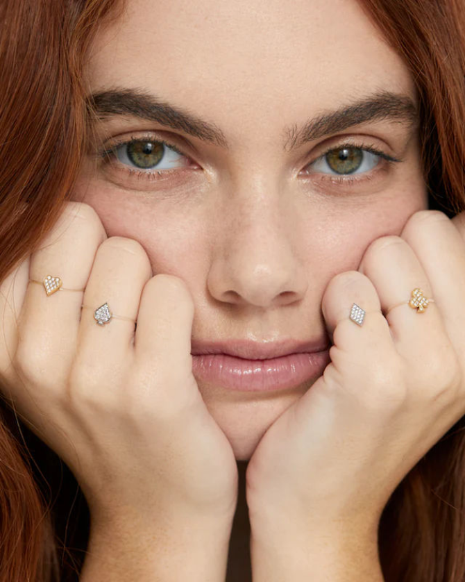 Joy porte au quotidien la bague Mini Hasard — « subtile mais symbolique, comme une présence discrète » — ainsi que les bagues Fairy, qu’elle superpose et réorganise selon son humeur.