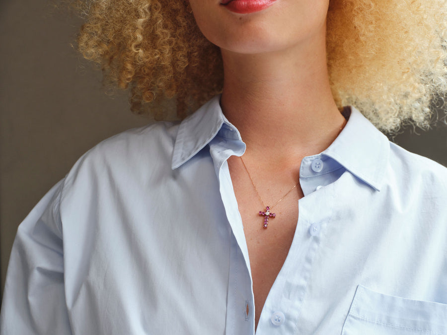 Clarissa Gioielli's cross necklaces are adorned with small heart-shaped stones, with a precious natural diamonds. From sophisticated rodolite to intense amethyst and vibrant London Blue topaz, each piece is a unique expression of faith and sophistication