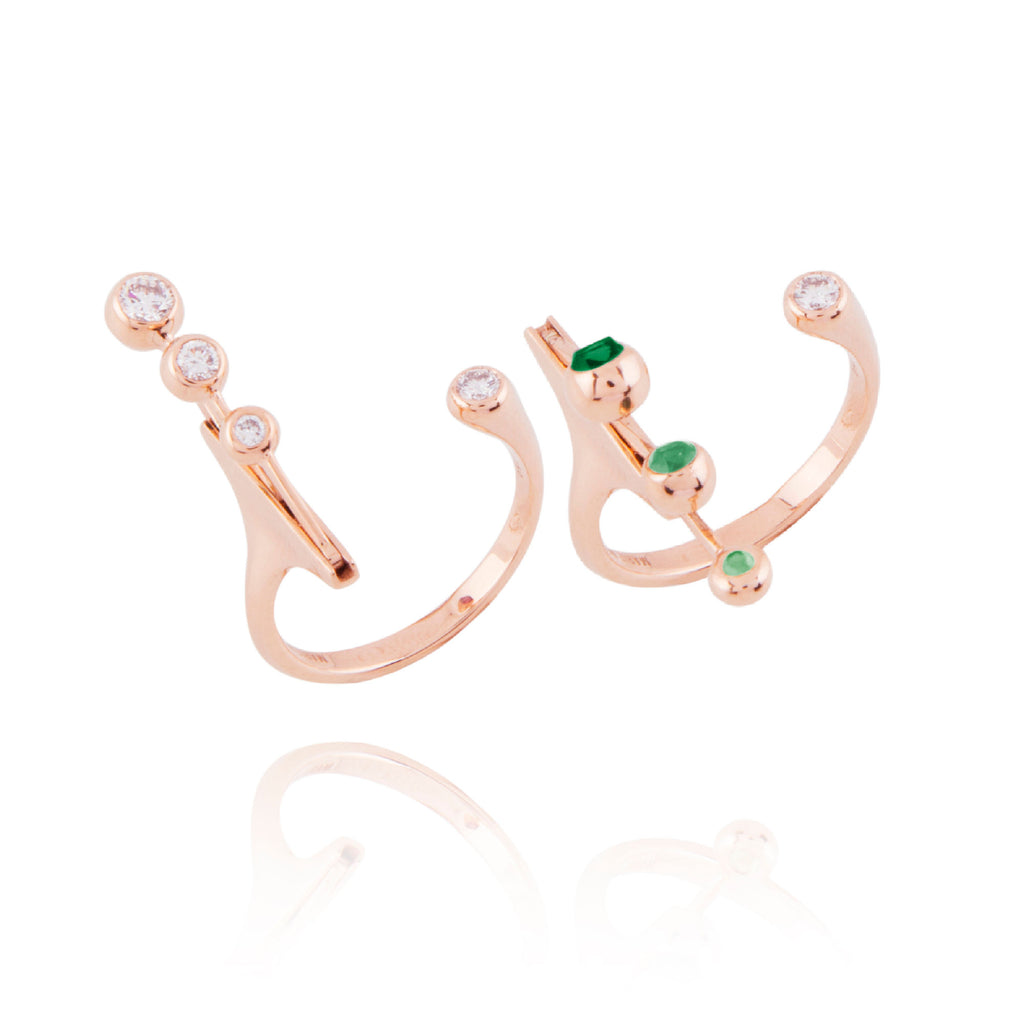 Crafted from 18 karat rosegold, the Dancing Open Ring is playfully responsive to every gesture of your hand. The 3 bezel-set diamonds of total weight 0.37 carat in a row can reverse bringing out the 0.26 carat bright green emeralds on the other side, offering an exciting choice of colours in an innovative design exuding pure class.