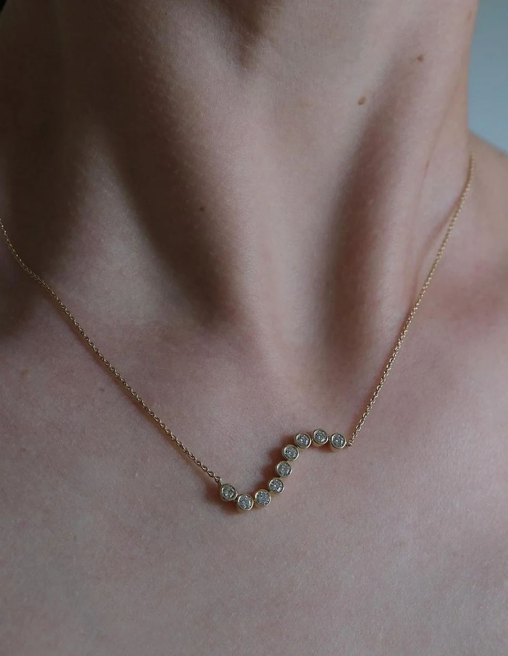 This Diamond Necklace features Diamonds with adjustable chain set in bezel setting with a flowing contour showcasing the movement of the rolling ocean wave