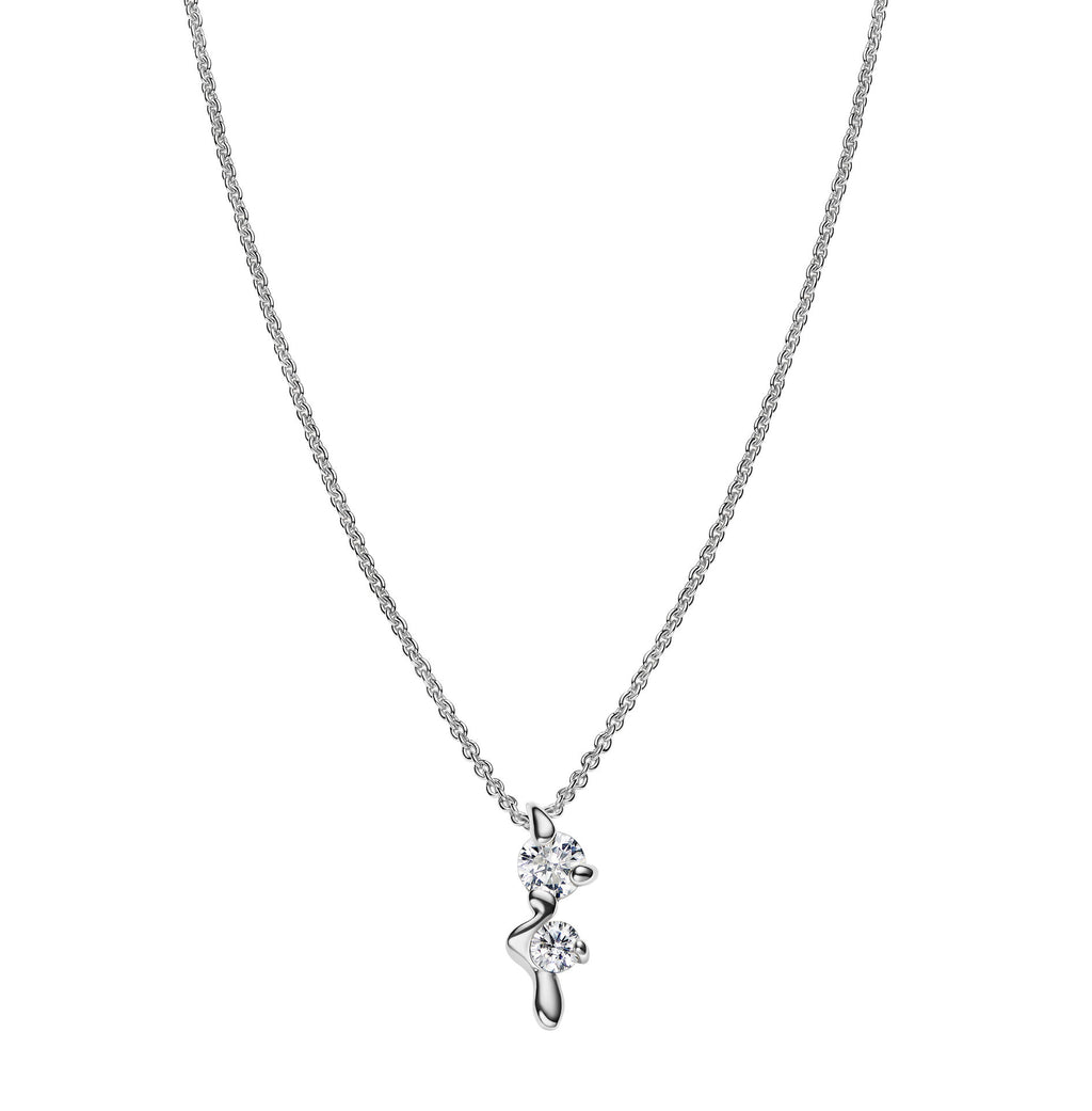 Designed in Denmark. Skilfully crafted in recycled sterling silver. Adjustable pendant necklace. Nickel free and hypoallergenic. Two white zirconia in a warped prong setting. Pendant is fixed to the chain and slides freely. Can be styled with other necklaces.