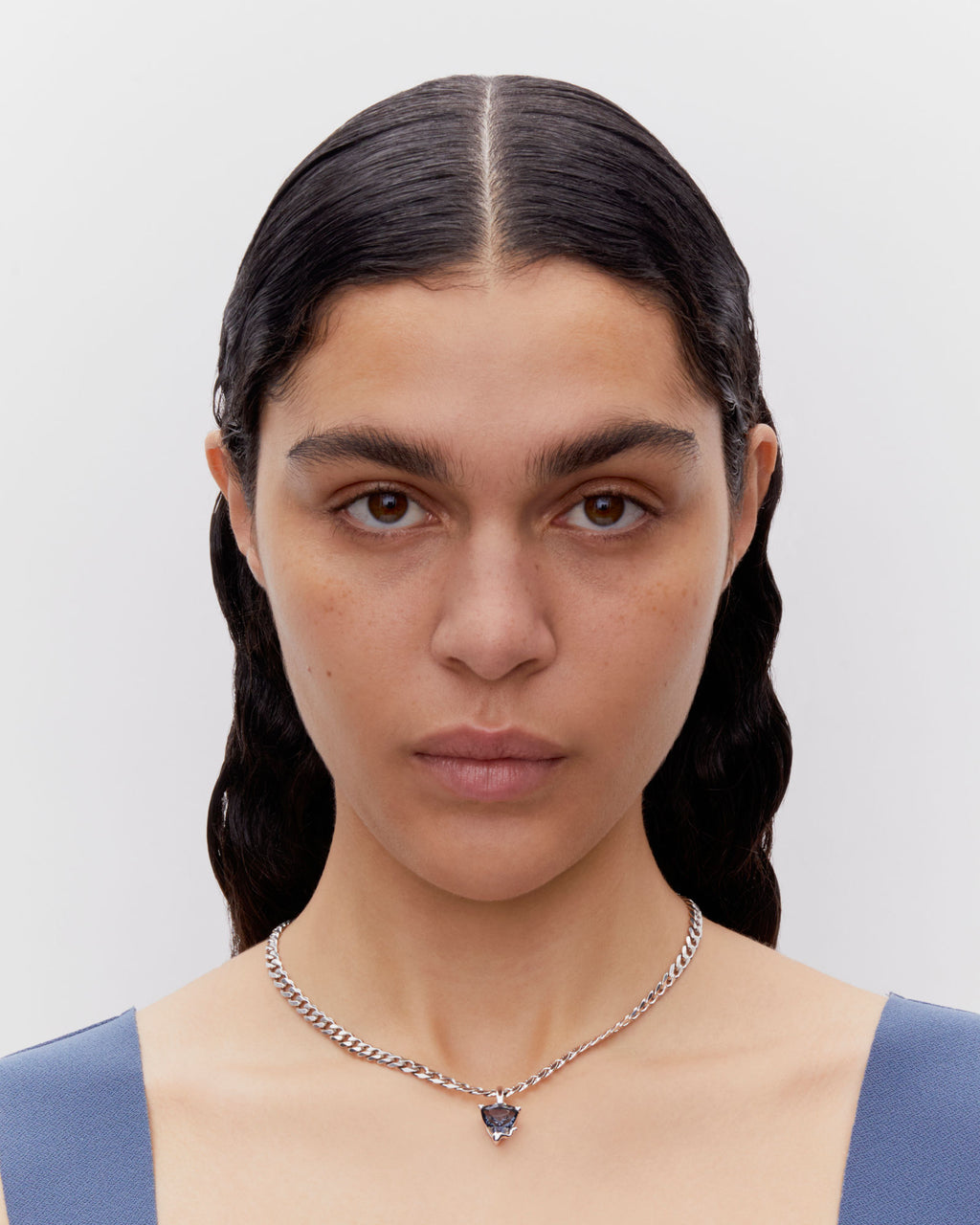 Designed in Copenhagen by Maria Black. Inspired by Tokyo street lights. Created from recycled sterling silver. A big chunky necklace that gives streetwear vibes. Features a large trillion shaped blue nanogem stone pendant draped in futuristic prongs. Pendant is removeable to allow for customisation