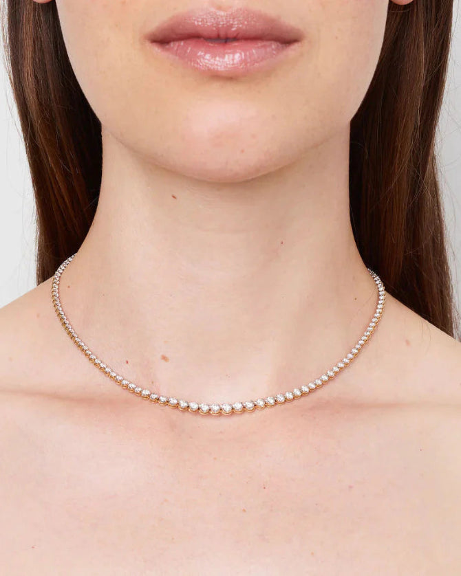 Stiamo assistendo a un'impennata di collane tennis graduate. In questo stile, i diamanti sono più piccoli alla chiusura e diventano gradualmente più grandi verso il centro. In questo modo si crea un bellissimo flusso ritmico che attira l'occhio e aggiunge un senso di peso e importanza al pezzo senza sembrare eccessivamente formale.