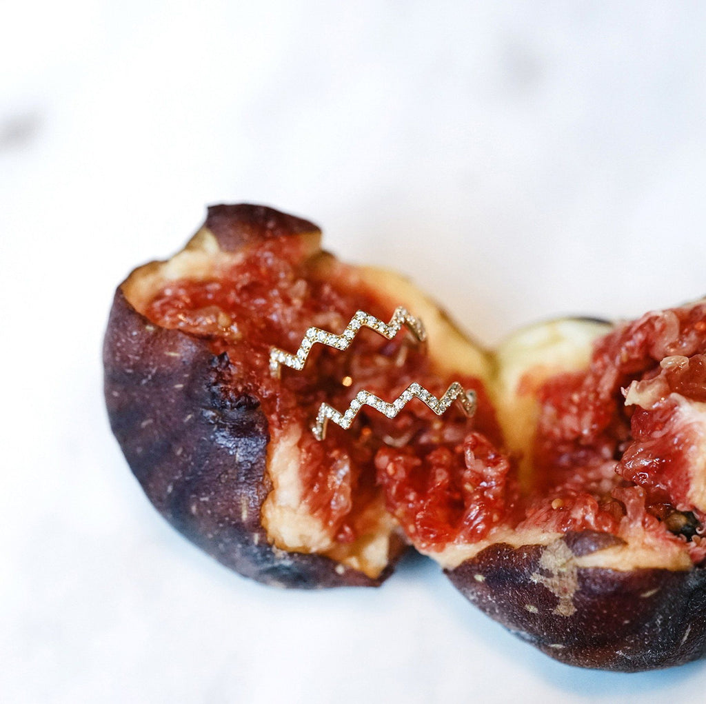 The Peak Ring is a tribute to life. The diamond paved ring band wraps almost around the entire finger never loses shape, no matter which direction it takes. The ring will accompany you through all your moments and its sparkling diamonds will bring a smile to your face every day. Whether worn alone or combined it shows wonderful sparkling diamonds in all heights and depths. Made of 18 Karat gold and 31 diamonds with a total weight of 0.19ct. The band is 1.3 mm wide and from peak to peak you have 3.9 mm. This ring is made by hand with much love and care in the Rivour & Guya studio in the Black Forest, Germany. The gold used in all Rivour & Guya rings is ecologically river gold from Germany, mixed with recycled gold (Mass Balance Principle). The diamonds used in Rivour & Guya are of a very high quality. The diamonds are at least the G color and SI clarity and they all come from Canada (Deviak and Ekati mine) and are cut exclusively in RJC certified manufactories.
