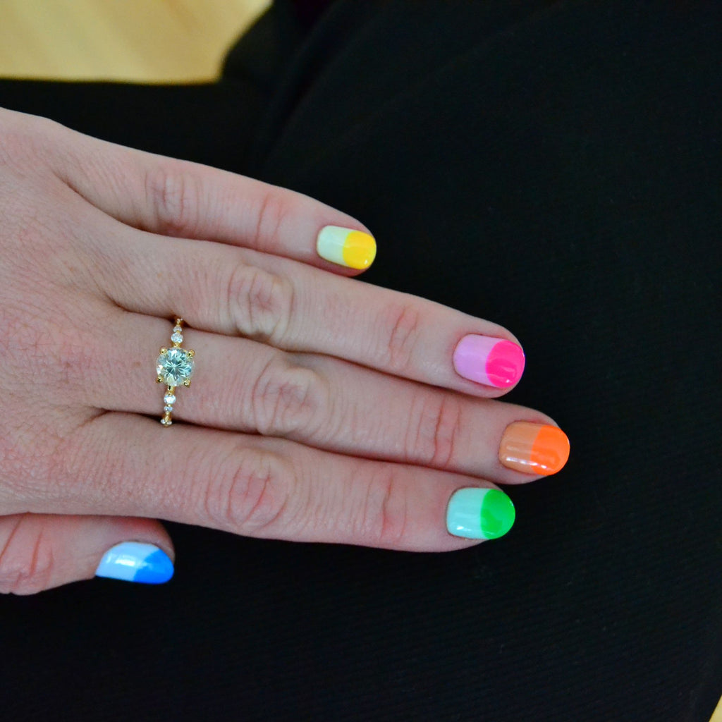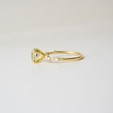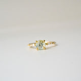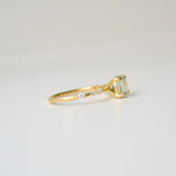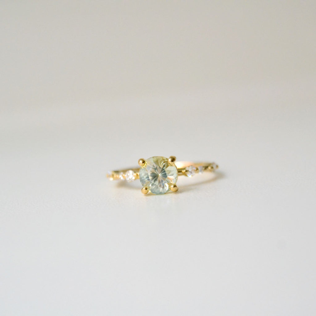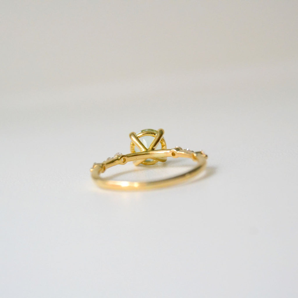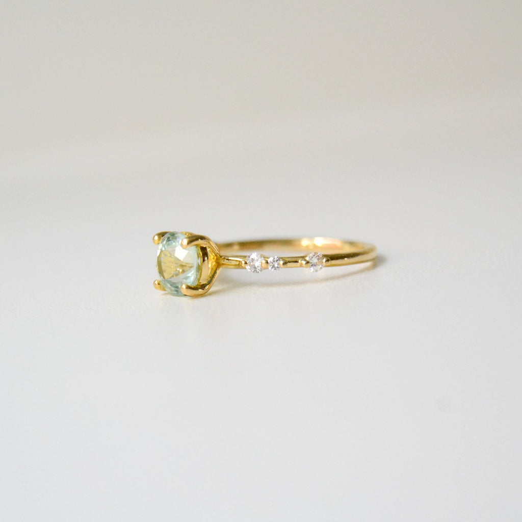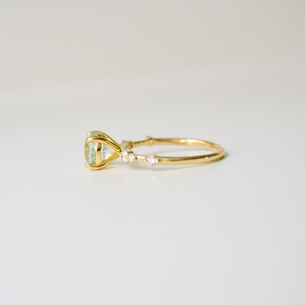 18K yellow gold // Natural, unheated green tourmaline (1.17ct) // VS1-TW diamonds (total weight of 0.15ct) Delivered with a certificate. The tourmaline in this ring is set in a high setting making it excellent for stacking with other rings. The tourmaline measures 6.36mm. The depth of the setting is 6mm. The diamonds in the band measures 1.5mm and 2mm. The band profile is full round and measures 1mm. All our rings are sized using European standard sizing. The ring is ready to be shipped in size 52 – resizing is possible and is free of charge