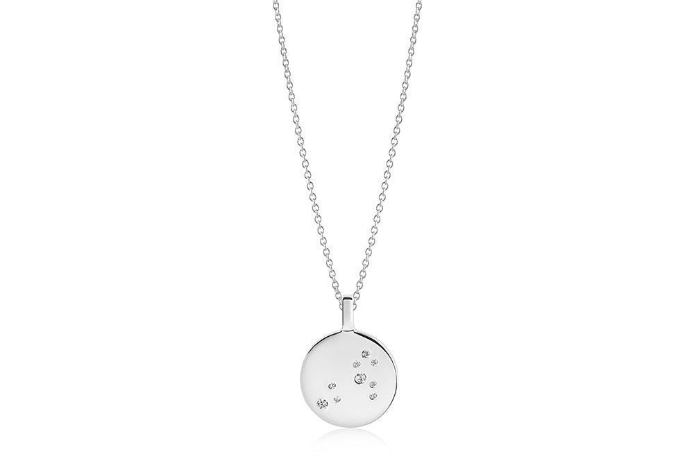 The Zodiaco Leo pendant and chain from Sif Jakobs is pure class in rhodium plated sterling silver. The disc pendant features a highly polished surface with the Leo constellation in facet-cut white zirconia. This elegant piece is ideal for the imaginative, stylish Leo woman who is confident in her fashion choices.