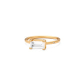 The delicate Nord White Ring with a polished surface in 18 karat yellow gold is elegantly set with a baguette-cut white topaz of 0.30 carats. The signature Ro Copenhagen brilliant cut white diamond is of 0.003 carats TW.VS .