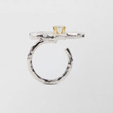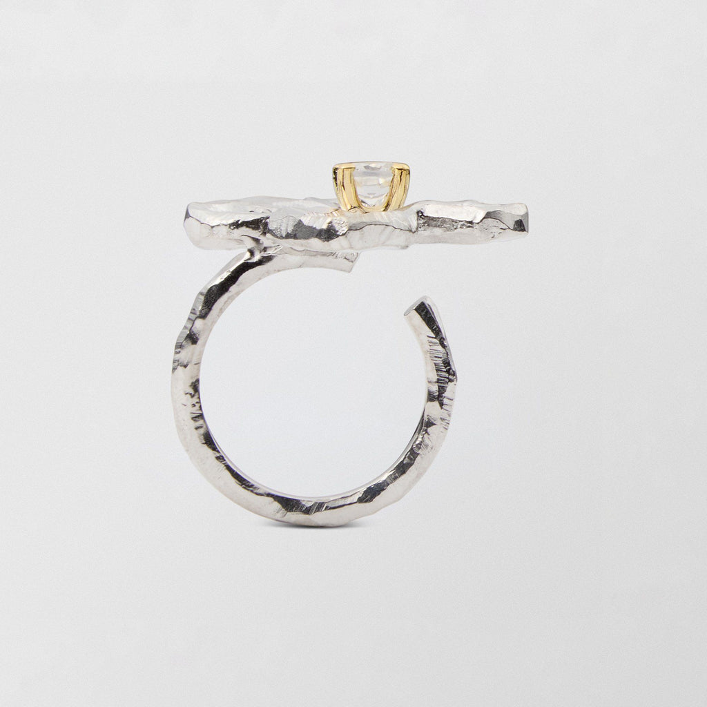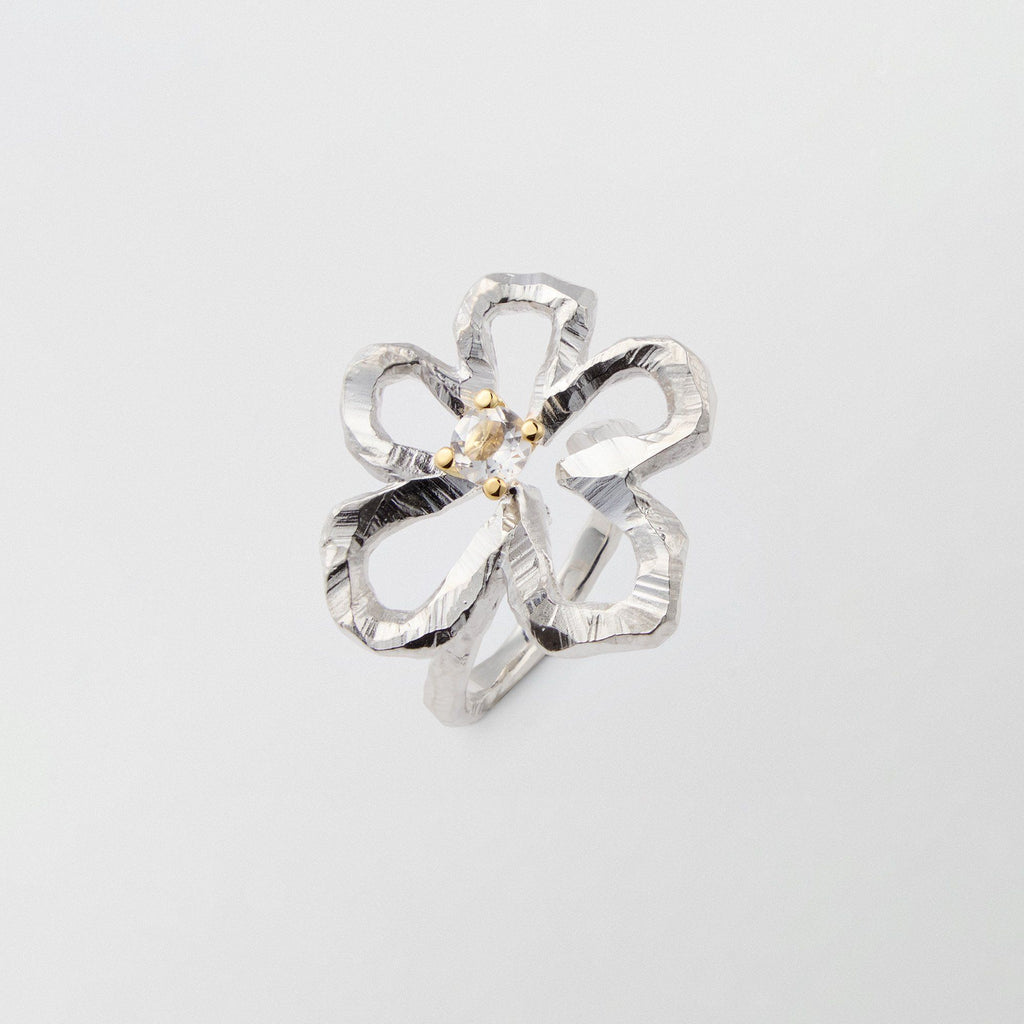 Ring in silver and 18K yellow gold with rock crystal, 3 mm, 28 mm. Like the Swedish Summer ring you can feel the flower floating over your hand, no shank is visible as it is open. In this ring a rock crystal is set in the centre of the flower in 18K yellow gold.